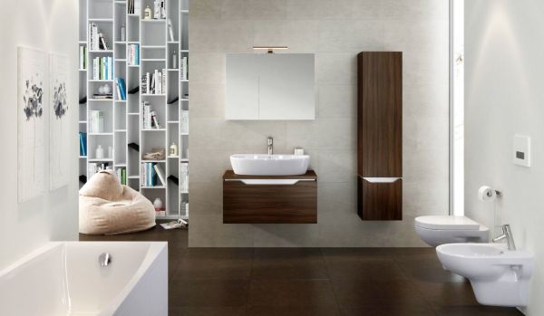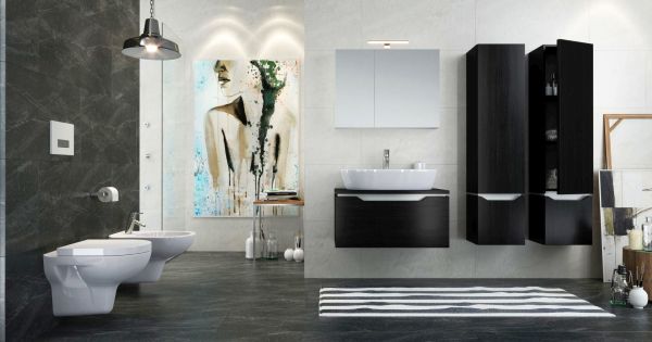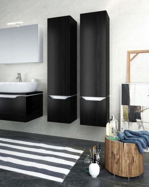 W skład serii wchodzą również szafka podumywalkowa i słupek, dostępne w dwóch odcieniach – czarnego drewna lub brązowego dębu. Uwagę zwraca zastąpienie tradycyjnych uchwytów przez trapezowato wyprofilowane wycięcie we frontach mebli. Szafka i słupek wykończone są kontrastowym elementem – białą wstawką, widoczną pod wcięciem uchwytowym. Element ten nadaje ciemnej bryle mebli stylu i lekkości.