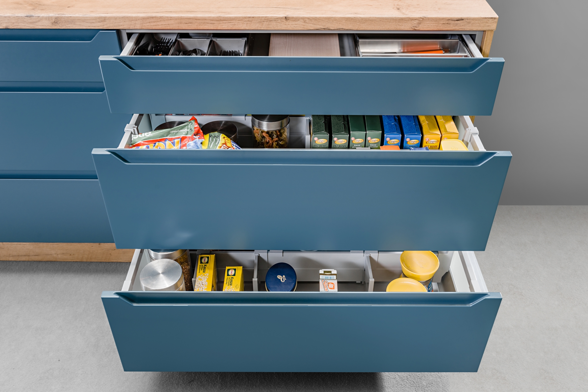 Ergonomiczne rozwiązanie: trójpodział szuflad, czyli trzy wysokości szuflad odpowiednio zaprojektowanych na różne grupy produktowe. Niska na sztućce i drobne akcesoria, jak folia spożywcza i papier do pieczenia. Wyższa na produkty spożywcze w standardowo dostępnych opakowaniach. Najwyższa, nazywana również magazynową, na napoje w kartonach czy zapas wody mineralnej w butelkach. Fot. KAM