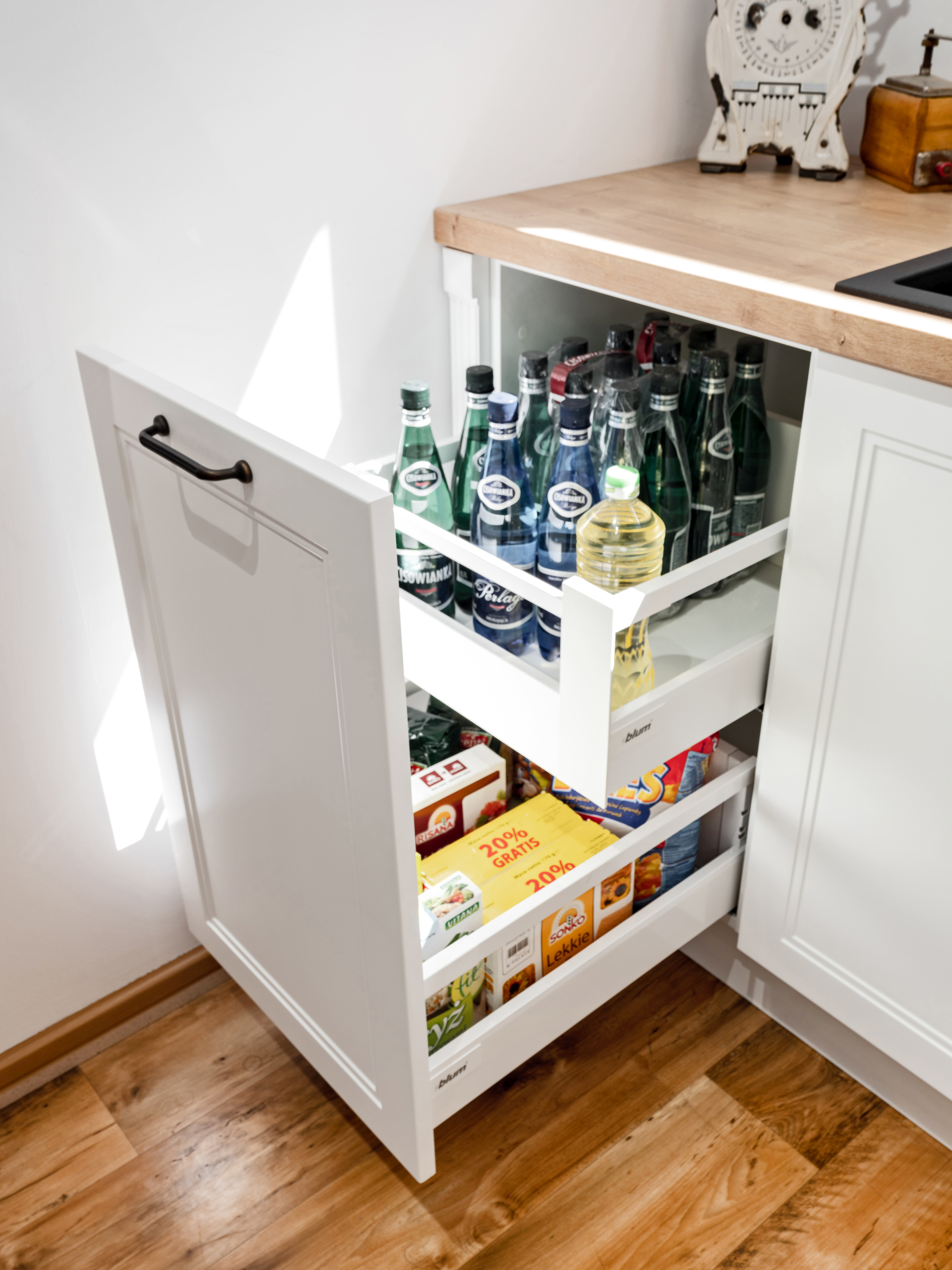 Szuflady możemy wygodnie wysunąć przed korpus mebli, co ułatwia wyjmowanie, a następnie odkładanie na miejsce. Nie musimy się schylać i niepotrzebnie przestawiać całej zawartości w poszukiwaniu określonych produktów. Od razu po wysunięciu mamy do nich pełen wgląd, nawet do rzeczy przechowywanych na końcu. Dzięki temu wszystko jest zawsze na swoim miejscu i pod ręką.