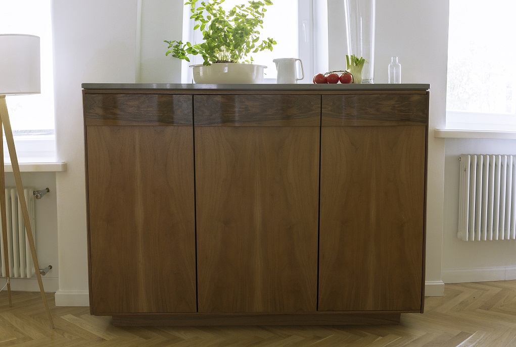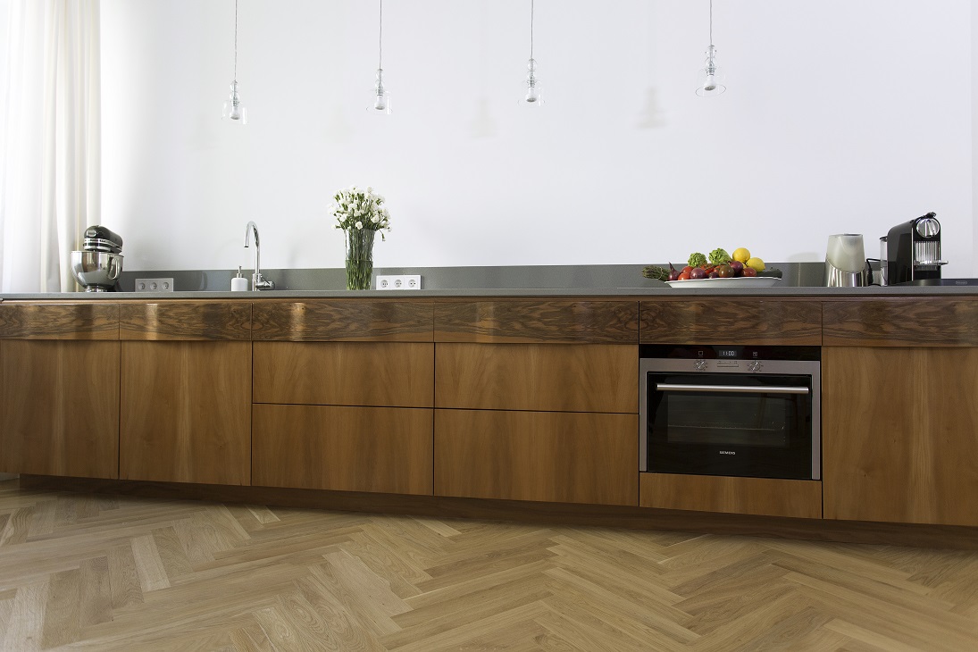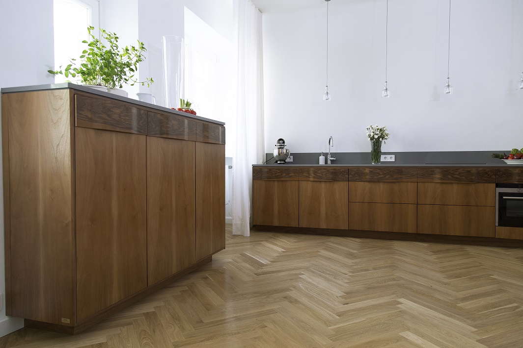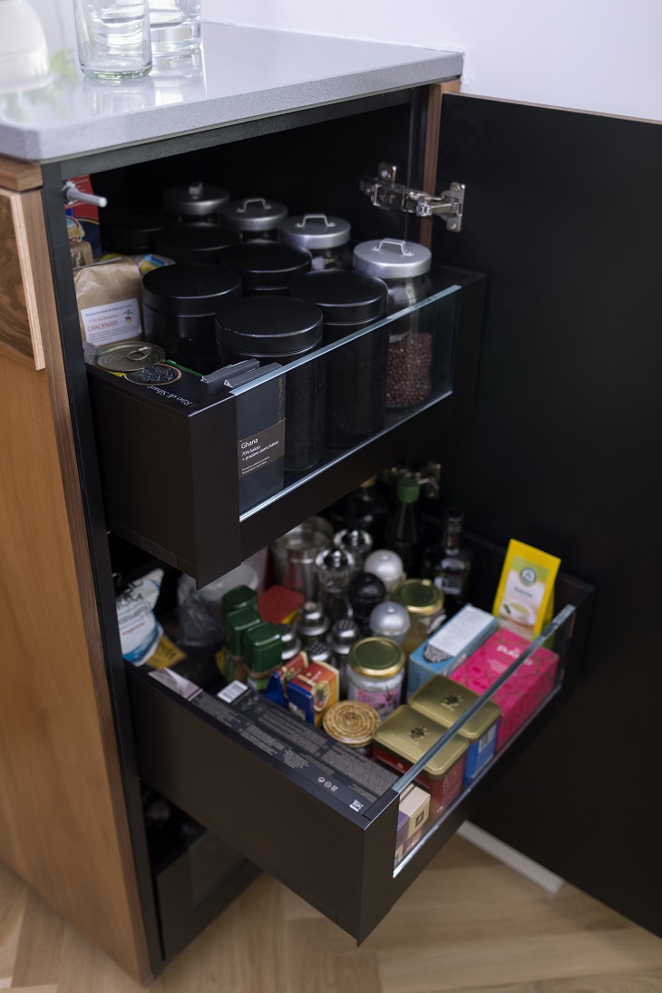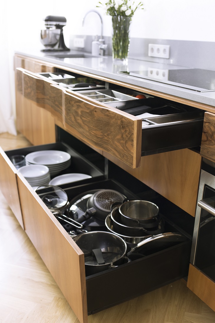 Blaty z grafitowego kamienia idealnie komponują się z frontami szafek w gładkim orzechowym fornirze, a szuflady o fallicznym kształcie tuż pod blatem wprowadzają do kuchennej przestrzeni intrygujący geometryczny element dekoracyjny. Jednocześnie są one bardzo praktyczne dzięki systemowi zamykania i otwierania TIP-ON oraz najnowocześniejszym systemom kuchennym. Wykorzystanie ich umożliwiło zrezygnowanie z uchwytów również w szafkach, a jednolita zabudowa jest jeszcze bardziej estetyczna.
