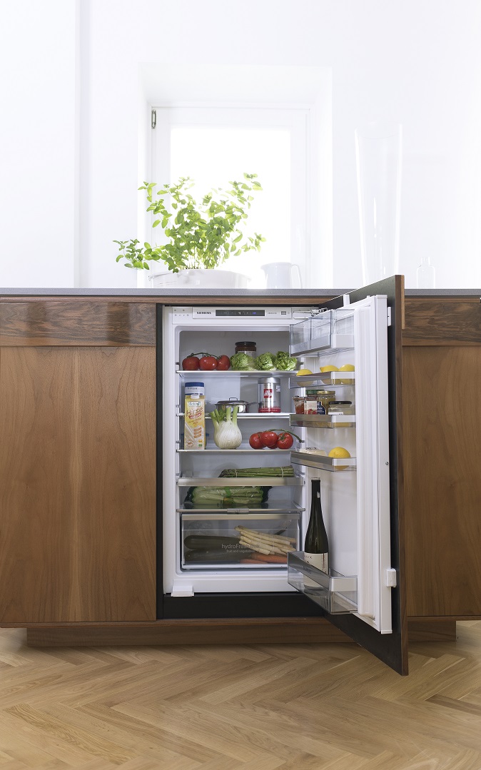 W dodatkowym elemencie zabudowy, słupkowej, wolnostojącej trzyskrzydłowej kuchennej komodzie przewidziane zostało natomiast miejsce na zabudowaną lodówkę. Zaskakującym pomysłem jest również umieszczenie szafki otwieranej nie od frontu, a z boku mebla. Patrząc
