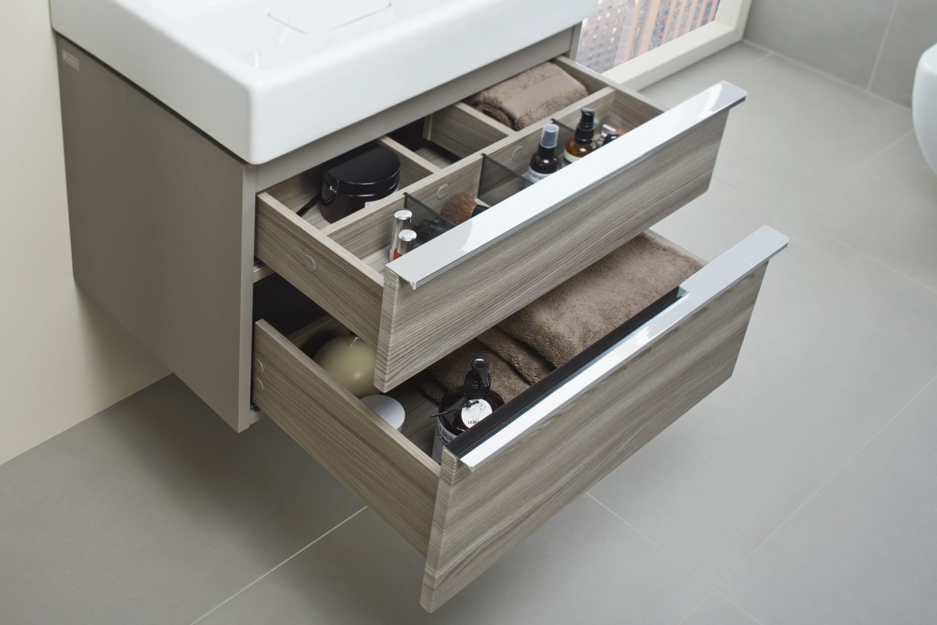 Szafki podumywalkowe Metropolitan dostępne są w trzech szerokościach, dostosowanych do wymiarów dostępnych w serii umywalek – 60, 70 i 80 cm. Szuflady i drzwiczki zaopatrzono w systemy cichego domykania oraz trwałe zawiasy. Ukryte prowadnice zapewniają pełny wysuw szuflad.