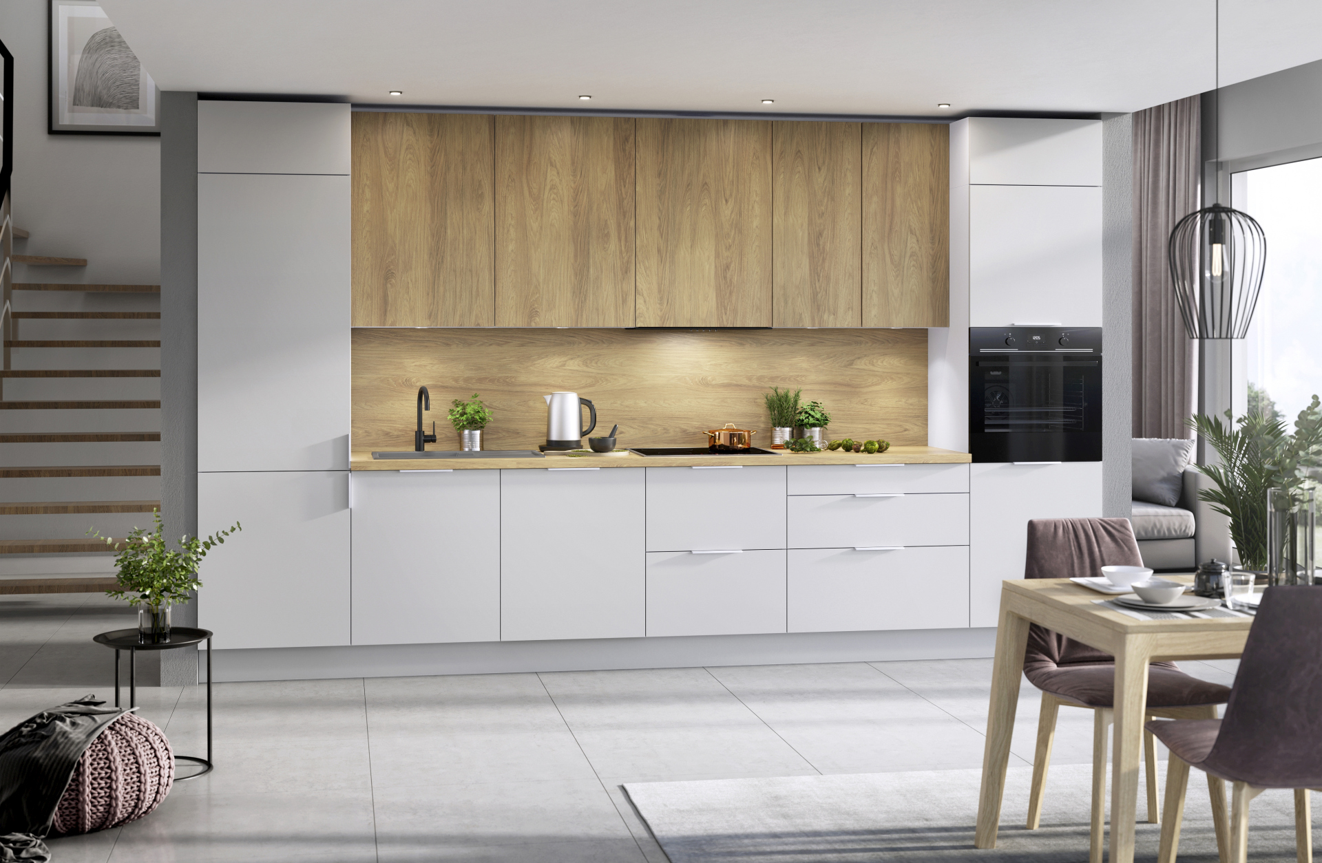 Meble w modnym kolorze czy może jednak uniwersalne dekory drewna? Jedno nie musi wykluczać drugiego! Nie masz pomysłu na aranżację kuchni? Połącz oba dekory. Będzie gustownie, z klasą, a co najważniejsze – pięknie i ponadczasowo.